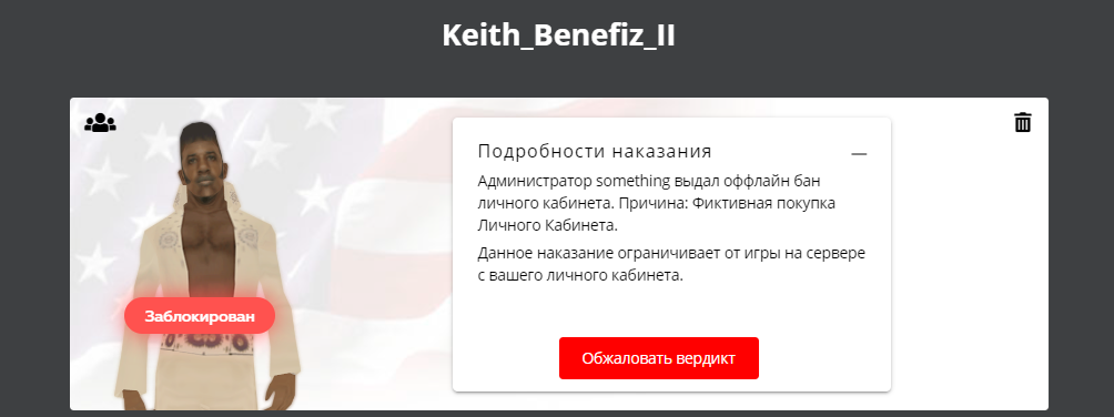 Суть жалобы: Ну я понял, что это слив, давайте по порядку начну. Я зарегистрировался на проекте еще в 2018 году, поиграл один день, вышел и больше не играл. Но через год я уже забыл и ник лк, и почту на которую он был зарегистрирован. Далее в 2019 меня позвал друг на гамбит, я сделал новый ЛК, поиграл с ним месяц может и потом на протяжении двух лет практически не играл на гамбите, поэтому без задней мысли отдал свой личный кабинет уже даже не помню кому. После этого я через год или два, не помню честно, зарегал еще один ЛК и накопил шкаф диглов в доме своего друга, но отлетел в перманентный бан. Мой кореш позвал меня в фракцию и ради того, чтобы я пошел с ним играть зарегал мне личный кабинет и попросил пару тех диглов из того зловещего шкафа, но я объяснил ему, что никаких диглов не будет и что это плохая идея, но он все равно зарегал мне ЛК и пустого персонажа, которого по факту уже не существует. Т.е. никакой покупки не было. После я начал активную игру на этом личном кабинете, которая длится уже два года вроде как и примерно в то же время мне разбанили старый ЛК. В прошлом году я получил ЧС за 25пп и другие нарушения, т.е. по факту у меня на тот момент было 2 личных кабинета и оба полностью принадлежали мне, т.е. моя почта, мой пароль и все персонажи тоже мои, но один из них был зарегистрирован моим кентом. При подаче заявки на реабилитацию у меня как бы был выбор, оставить одного персонажа с обнулением имущества и отсидки 30-ти дней в садке на одном из двух личных кабинетов и я выбрал оставить своего уже основного персонажа на ЛК, который мне зарегистрировал мой друг. После этого я уже не являюсь ЧСником проекта и полностью откупился за все свои грехи начав чистую игру, стараясь не нарушать правила проекта.