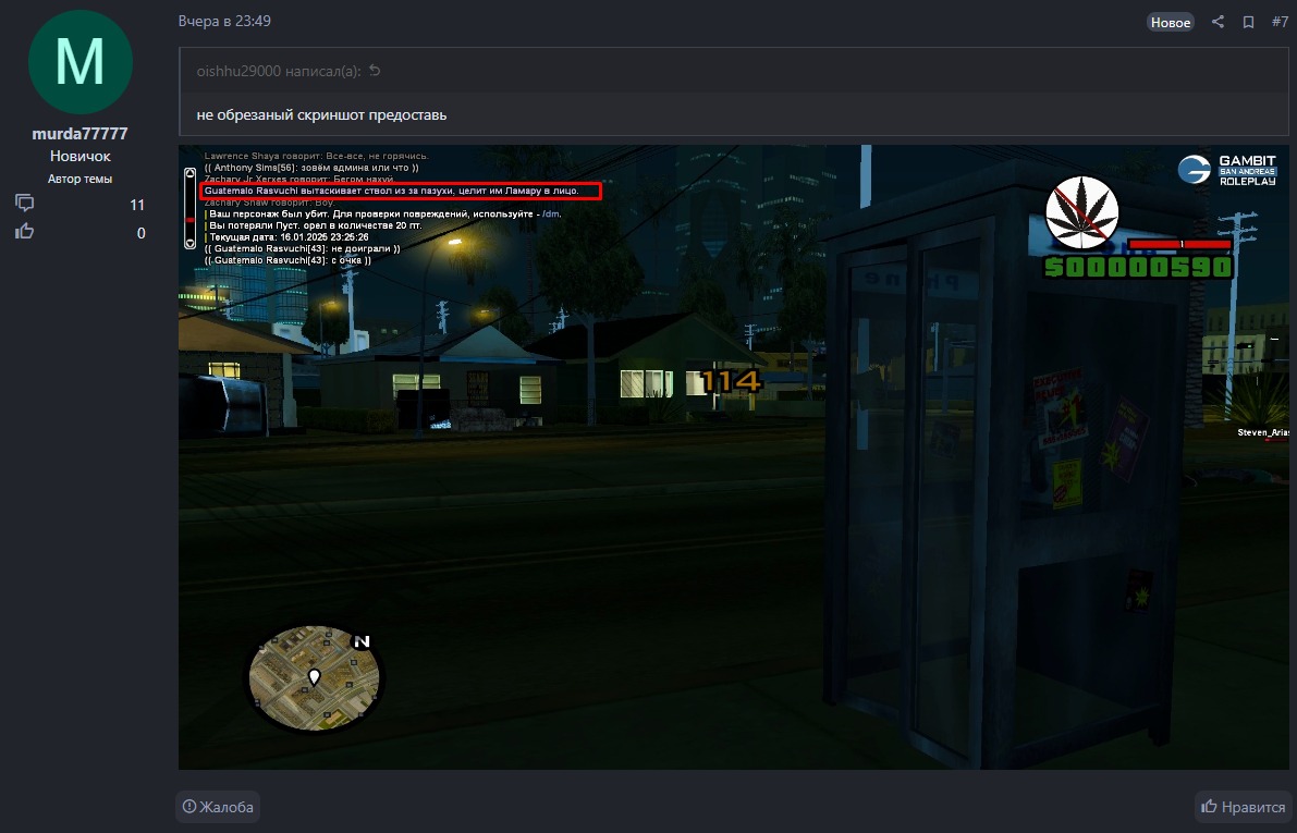 Ссылка на доказательства наказания/нарушения: https://forum.gambit-rp.ru/threads/532329/#post-6745446