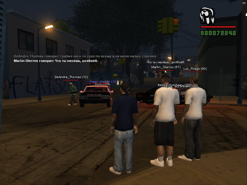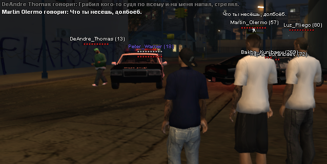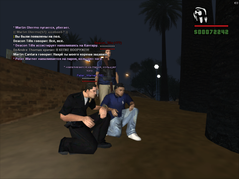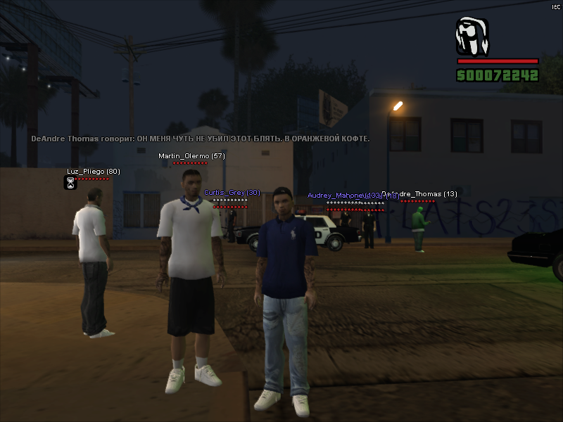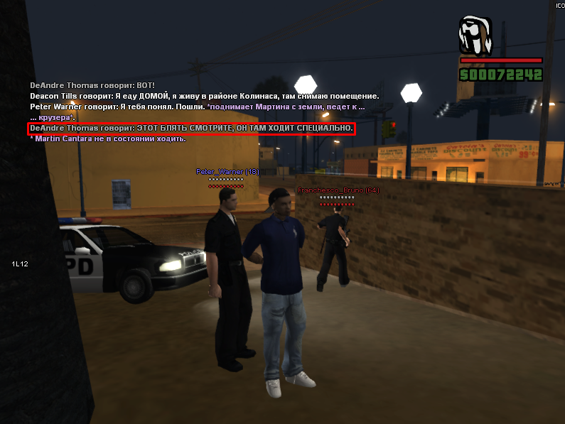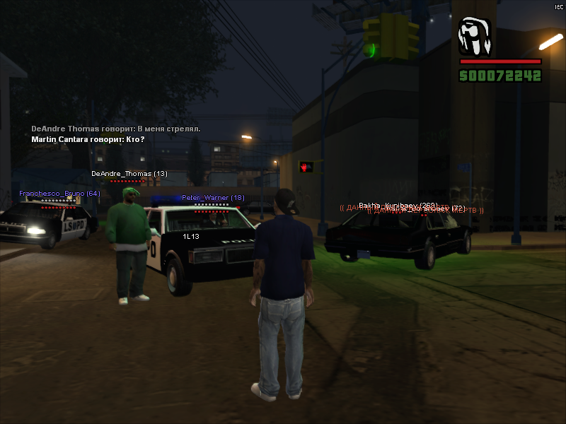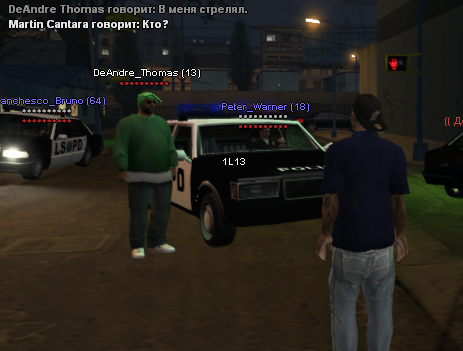 Дальше, я сдал вас ментам, конечно. Твой друг Luz_Hilego ВТУПУЮ СМОТРИТ КАК ТЕБЯ ПАКУЮТ, А Я ПРЯЧУСЬ ВОЗЛЕ ПД. Как только копы отьезжают, через 3 минуты за углом он с Edwin_Cortez тупо расстреливает меня с УЗИ. Ну я бы понял если бы вы отыграли это как-то, что-то там поделали, нашли меня, и т.д.