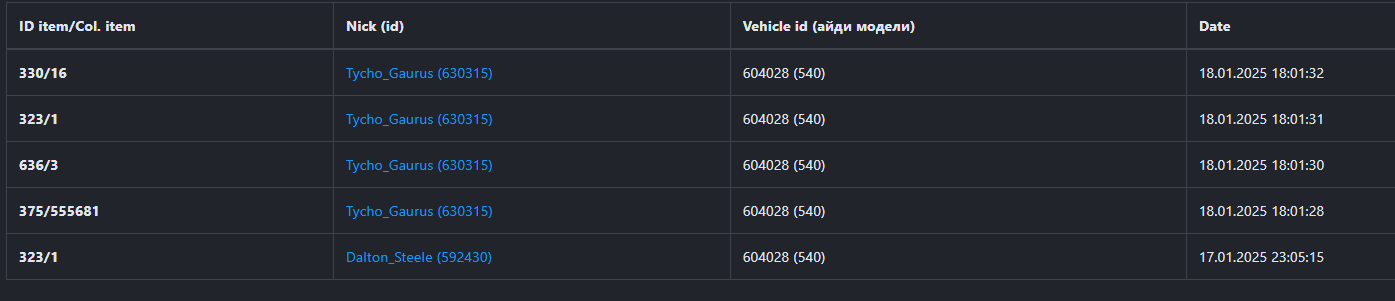 Суть жалобы: Залутали кучу вещей из моей машины машины 604028. Прошу проверить по логам.
