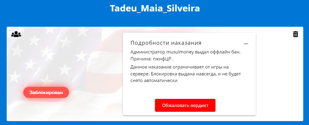 Суть жалобы: Прошел уже почти год с момента блокировки этого аккаунта, с того времени ливнул с проекта и не играл долгое время. Вот, спустя определенный период, появилось желание вновь вернутся. Получил блокировку за проявление фангейма и несерьезное отношение к ролевой игре, за что чудовищно каюсь. Сейчас я решил возобновить игру на проекте с серьезными намерениями, планирую отредактировать этого персонажа и пойти играть в одобренную фракцию, которую уже для себя приметил, а вместе с этим и вести топик персонажа, как только освоюсь. Мое отношение к игре кардинально поменялось и я более не преследую цели заниматься откровенной залупой на сервере, хотелось бы попросить вас пойти на уступки и получить разблокировку игрового аккаунта. Заранее спасибо проверяющему администратору.
