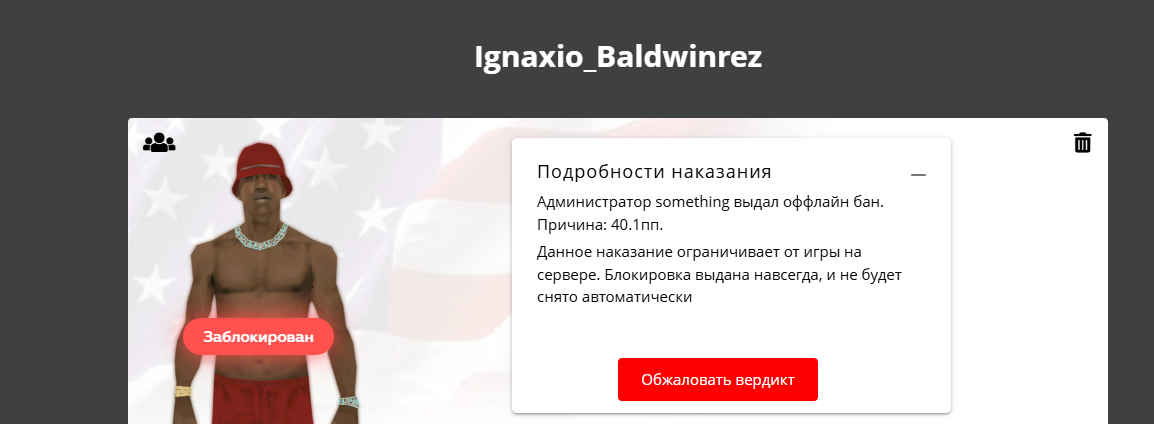 Суть жалобы: мой ник Ignaxio Baldwinrez, забанила этого персонажа за 40.1 пп вроде, готов ответить на все вопросы
