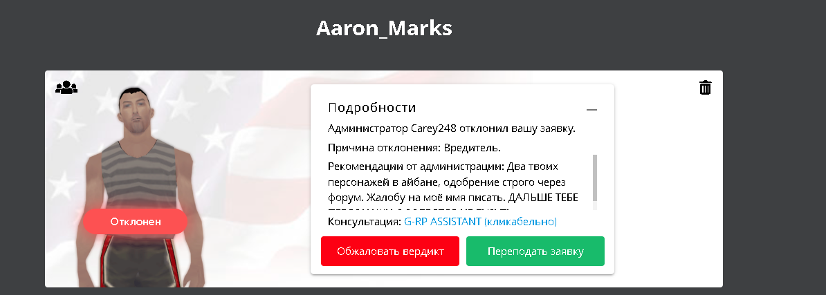 Суть жалобы: Прошу одобрить данного персонажа так как два перса забанены за одно и то же плюсом по причине махинации. Я никого не шотал на наоборот играл во фракциях и показывал гейм какой некакой.