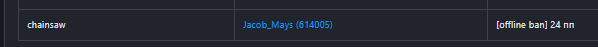 Суть жалобы: сделали вредителем за то что я передал бензопилу с негра на негра а потом её продал за 30 тысяч что является махинацией, конечно бан понятен но уже достаточно времени прошло, так я и резать цивилюг не пошёл этой бензопилой, а просто продал челу и я готов поспорить, эта бензопила уже у цивила какого то, поэтому снимите пермач, у меня и слоты занимают эти 2 чела, так ещё и из за того что я вредитель я не могу бедного араба зарегать, но я больше не буду передавать ганы