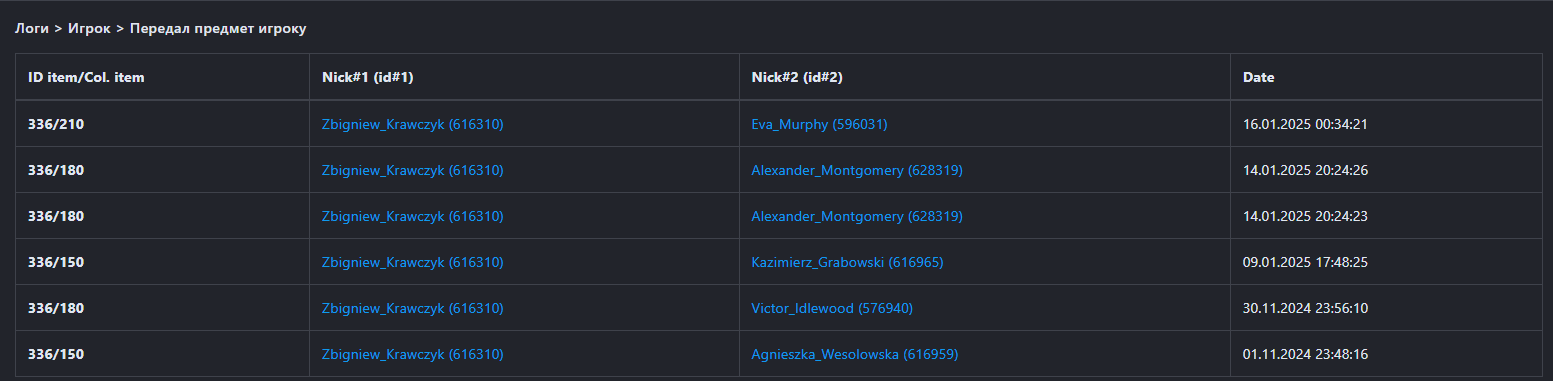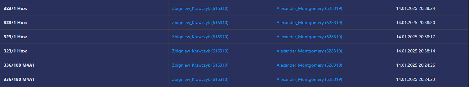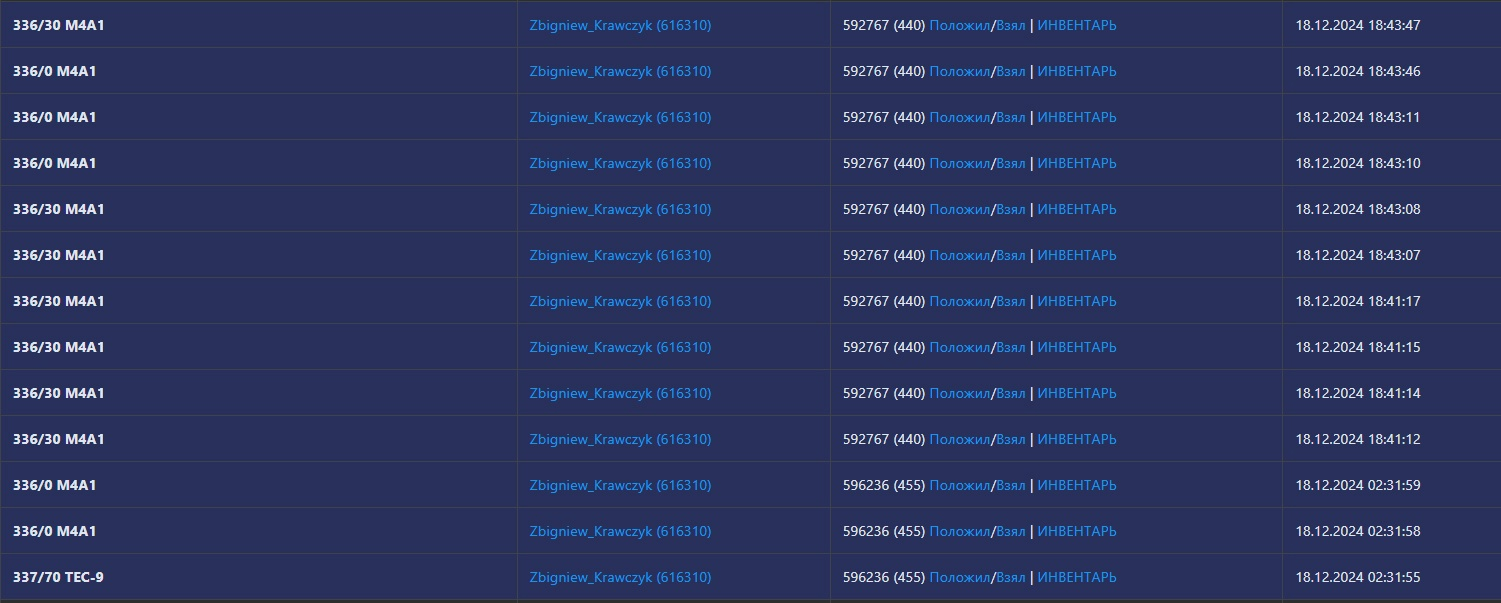 собственно говоря видим сплошные карабины и пп .видим сплошные передачи игрокам, есть и те которые не относятся к твоей фракции. все передачи происходят в небольшой промежуток после закупа. ну и собственно это всё складируется в некоторое число машин, не только в твои, конкретно в машины твоих соигроков ну и твои, не знаю, для чего себе такой вкусный фургон набивать.