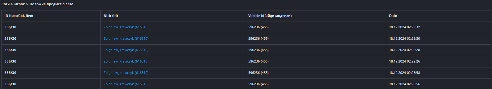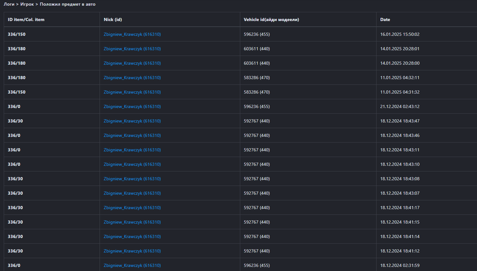 я если честно удивляюсь откуда ты брал такое количество что бы за один день две страницы автоматики положить в машины. В некоторых машинах количество как осталось так и лежит, остальное ты достал и то ли потерял по ходу игры, то отдал, в логах передачи о тебе не много пишеться в целом. Больше всего интересна история с ФБР, зачем закуп ездить забирать если с тобой ведётся активаня игра с са-ес органами. я не знаю что сказать честно, давно тебя знаю и не подумал бы что ты какой-то чернухой занимался. оставим это дело на проверку и пусть уже решают