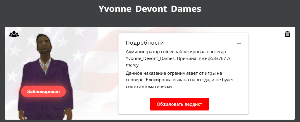 Суть жалобы: Пересмотр жалобы от игрока, не считаю администратора рассмотревшего данную жалобу на меня компитентным в данной ситуации.