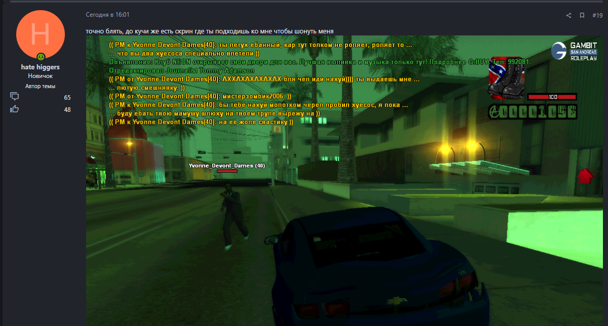 Я не выдержал его оскорбления в мою сторону, оскорбления моих родных, и как законопослушного гражданина РФ, его нацистких высказываний. Я ранее, такой хуйней не занимался. НО, пока я с ним пытался на этой основе словить гейм, он меня на этом скрине давит, когда уезжает.
