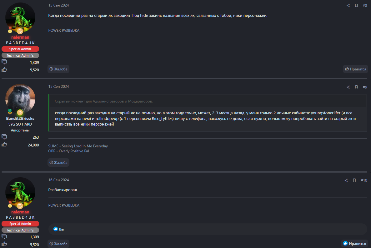 14пп это дм, окей, мы его сейчас будем разбирать, но 15пп, под это я точно никак не попадаю, у меня 8 персонажей, поскольку я докупал слоты за донат, а других лк у меня нету. ну точнее был раньше еще один лк, но я уже решал это с технической администрацией и мне его удалили, закрепив за мной только мой нынешний лк. так же прошу заметить что весь лк из 8 персонажей у меня был абсолютно зеленого цвета