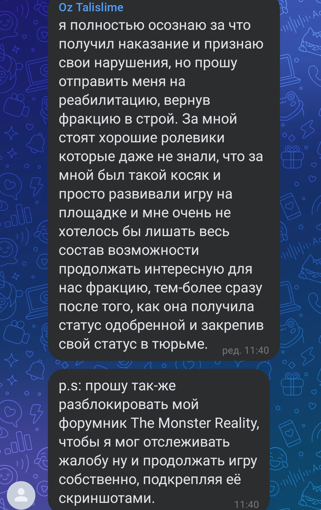 Суть жалобы: Пишу от лица Пэдро Лоеры. Снесли аккаунт, форум, отправили одобренную фракцию в архив без каких-либо на то причин, лк снесён по 25пп. Хотелось бы каких то объяснений, не промышлял ничем злостным, развивали активно игру в садке и тут прилетает такой момент от ауфа, хотя обычно даже когда лк игрокам сносят, то не архивают их фракции и не сносят форумники до 2036 года.