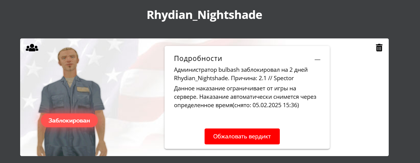 Суть жалобы: дружище выдал бан за 2.1 на 2 денька. бро, это был даже не то что локальный фг, это ничего серьёзного. то что я гидру военную из базы военки дотолкал почти до фк не нарушило же никому атмосферу. было утро, игроков не было, я один был вообще, просто по приколу. что плохого то? если это кому то всё же атмосферу испортило (хотя кому если никого рядом не было) простите пожалуйста. шутка, не более