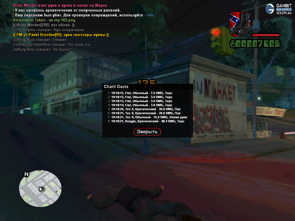 Суть жалобы: Ну завязалась драка у нас с ребятами. В моменте один из типов достал тек-9 и начал по нам шмалять, когда причины на то не было (шотнул вообще без игры). кстати в меня еще с дигла выстрелили, что замететил уже только на скрине. даже у админов спросил кто нас шотнул. (мои кенты которые были Pavel_Drozdov Brian_Morder)