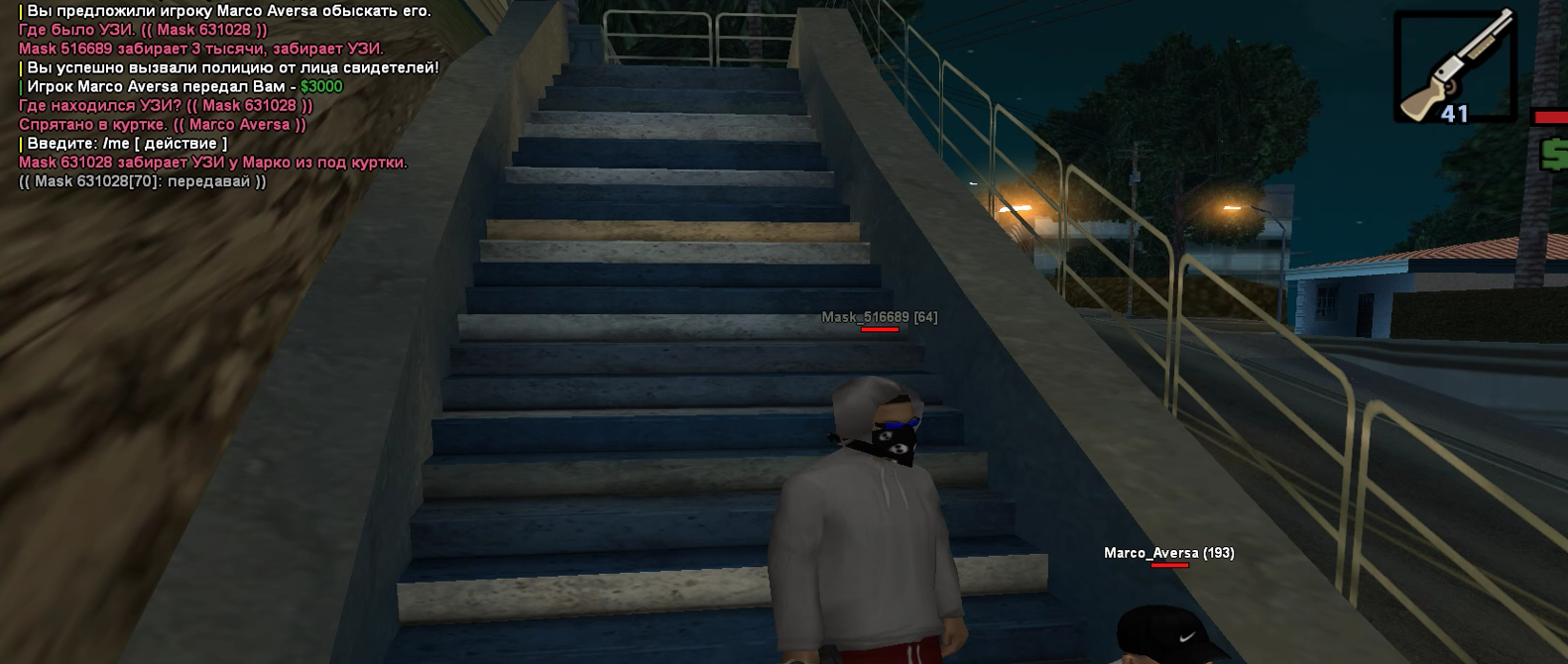 Суть жалобы: Зашёл в игру, вышел из инты, меня грабят три тела, с ходу играют, что забирают у меня деньги и УЗИ, которое на ситуации засвечено не было и мной обыграно тоже не было, настойчиво спрашивают в ду где лежит оружие, я в ду ответил, что в куртке, после грабители требуют отдать им оружие, хотя я делать этого не обязан, зовут на ситуацию колпачка, он говорит, что я должен отдать оружие