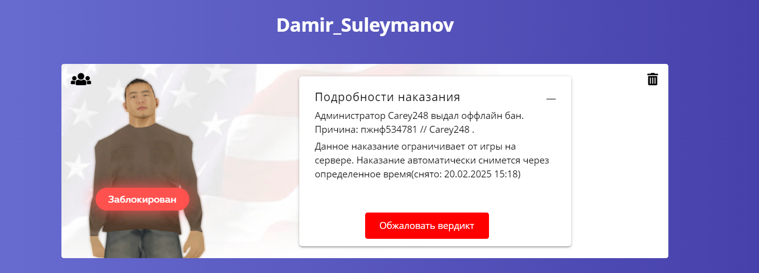 Суть жалобы: Здравствуйте администрация. Хотел бы попросить амнистию на этого персонажа, пересмотрел взгляды на игру и понял что реально был не прав, щас в планах вести топик в СП и играть в криминальной фракции, так же хотел бы извиниться перед админом @Carey248 за мои "добрые" высказывания в ВК, реально хочу поиграть нормально, пересмотрел взгляды на игру и понял, что был не прав.