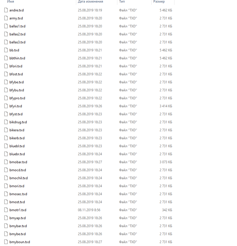 В том то и дело что у тебя нет dff файлов, каждая заменка состоит из txd и dff, они обе должны быть в папке