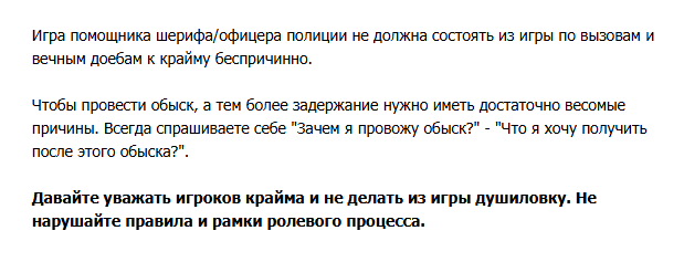 Вот такая игра в стиле Cops and Robbers не очень прикалывает, где второй стороне никаких шансов не дают, а после изымают оружие, не спорю правила лояльности есть, но решает игрок, но вопрос, о каком взаимодействии идёт речь, если данный игрок игнорирует всё, правил уважения, как понимаю нет, ну и от меня такая же суть будет при взаимодействии с ПД - любое задержание - будет расстрелом, т.к политика лояльности недействительна.