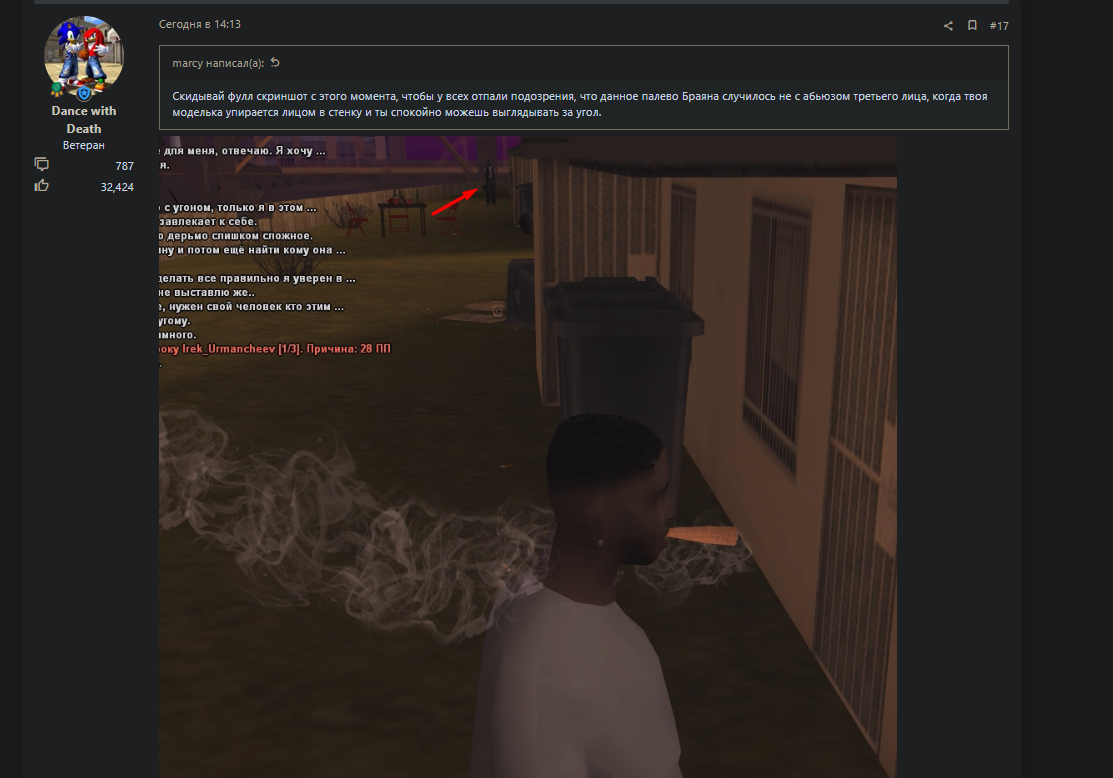 Администратор оправдывается то сначала тем, что он член банды БПС и работает по сговору о двойном нападении (у него нет на это никаких доказательств, ровно потому, что ник не появлялся ни на одной скриншот ситуации) и тем, что якобы, у него нет скриншотов доказывающих это, т.к. он "не обязан скринить каждый свой шаг" - когда такие вещи точно должны обыгрываться на СС, а ТЕМ БОЛЕЕ, что в последствии этой перестрелки я и мой соигрок были забанены до ТОПИКА НА ЦК на 1 день. Будет ли уместно сказать, что никакого топика и не было вовсе, и это можно расценивать как наглую попытку фракции БПС и в частности их нового друга - администратора marcy, срывать нам игру из ооц побуждений уже второй день подряд своими выдуманными причинами на стрельбу за которые на всю эту компанию уже написана огромная жалоба со всеми ДОК-ВАМИ? Думаю да, будет.