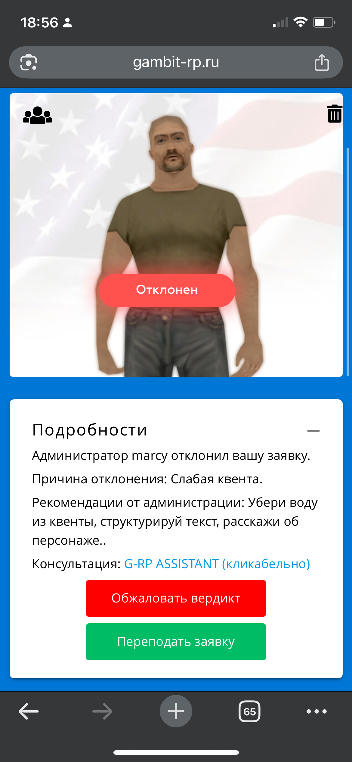 Суть жалобы: Здравствуйте. Подаю квенту персонажа уже раз 7-ой и честно не понимаю что не так, до этого писал и более слабые квенты, все работало, сейчас же, пишу про персонажа, мне говорят описать более последовательно, не перечислять черты, пишу последовательно, мне говорят вода, расскажи про персонажа. У администратора какие-то идеальные требования, которые я не могу выполнить просто, я считаю я смог передать суть персонажа и не вижу причин отклонять квенту.