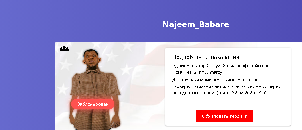 Суть жалобы: ну жалобу я на этих шайку обгашеных оленей уже сделал, так что придется и на вас уважаемый администратор, я не хотел выходить клянусь, у меня сработал античит и вовсе игра можно сказать зависла и у меня такое частенько бывает, скринов не успел сделать у меня просто сбой был по типу Closed че то такое сервер, типа ошибка и крашило, я перезагружал комп пока короче захожу вижу бан-чуть ли не ною потому что я не специально выходил у меня короче просто экран можно сказать завис потом захожу пишет клосед этот и так по много раз, они как врезались в меня у меня поебень какая то было сразу, типа система выкинула типа