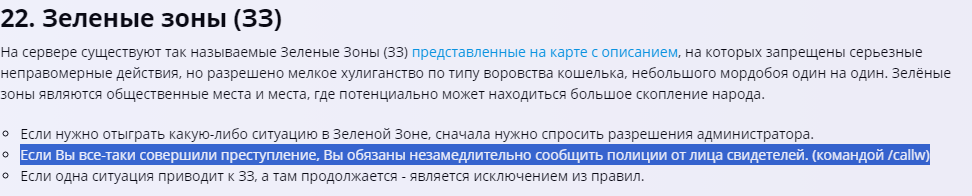 играешь криминальные действия даже ту же драку, то ты обязан незамедлительно произвести звонок от лица свидетелей в 22 правиле это указано, админы подчеркните данные слова, раз он не понимает что нарушил.