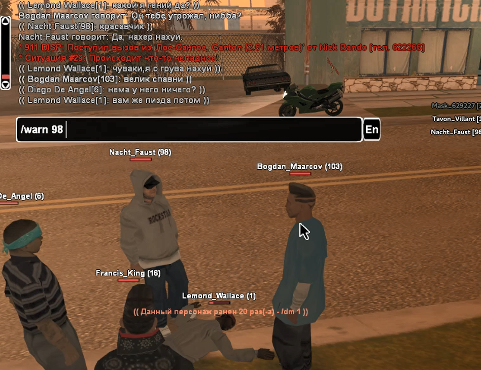 вы с товарищем пытались провоцировать фракцию на агрессивные действия игрой, а что касается вас, вы вовсе убежали избежав тем самым драку, и попытались достать свой нож без отыгровок в активной драке.