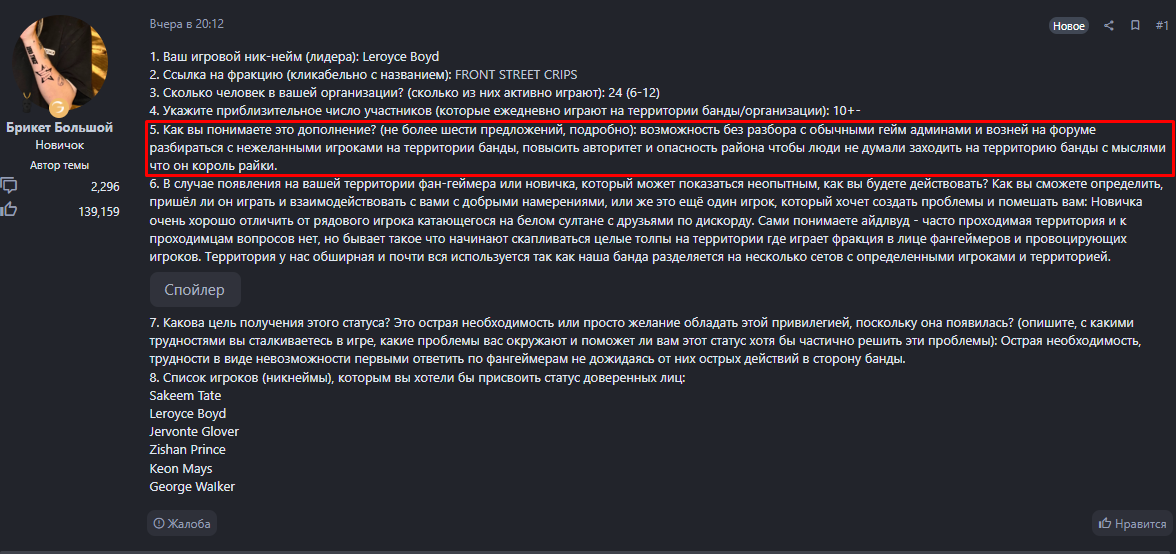 ну я считаю что это не уровень ролевой игры топикстартера одобренной фракции несущей статус гринлайт, что потенциально привлекает новичка, который будет брать с вас пример. Ты можешь сколько угодно усираться, что сделал всё правильно, и даже если эта жалоба будет отклонена мне будет ни жарко, ни холодно, я отсижу полуторочасовой пк и продолжу свою игру, но при этом ты как ролевик просел в моих глазах. Тебе же даже сейчас яиц не хватает признать, что ты захотел стрельнуть и стрельнул, хапнул адреналинчика.