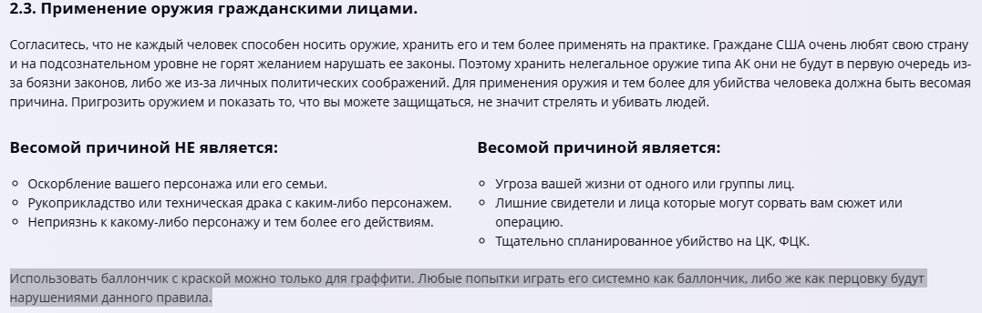Но вплане игры если произойдёт такая ситуация, то будет ли запрещено залить игрока краской, или же нет? Всё же я не отыгрываю его как перцовку, а как краску, но 2.3пп гласит о том, что запрещено играть баллончик как оружие или же перцовку.