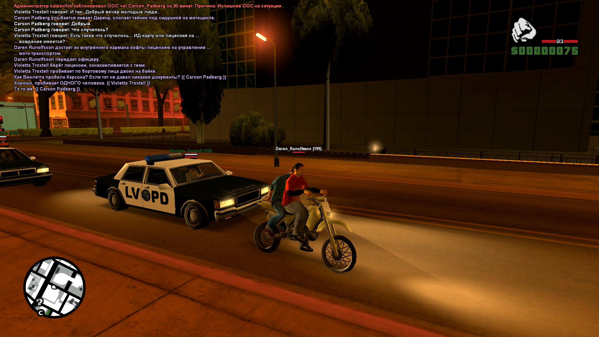 Суть жалобы: крч сразу к сути началась погоня нас подрезали, одного копа( Violetta Troxtell ) мой друг благополучно скурил и заставил сдшника в принципе как и заложено природой благополучно ОТКИСАТЬ , меня кикнуло, я снова захожу в игру подьезжает другой коп через секунду и не дав мне раздуплиться шотает меня без каких либо отыгровок (стрелок на тот момент уже благополучно ушел, в руках оружия у меня не была) в последствии я банально получил пк так что не удивляйтесь что на скринах я стою, на самом деле одна компашка сдшников в которой я полагаю есть еще и этот грант уже не первый раз ловит меня и моих товарищей, по крайней мере ПЫТАЕТСЯ ловить меня, не знаю что мы им сделали, но я часто слышал от моих товарищей про всякие странные мувы с их стороны, но я могу сказать точно у парней конкретно встает когда они видят богоподобного меня и моих богоподобных товарищей в сети