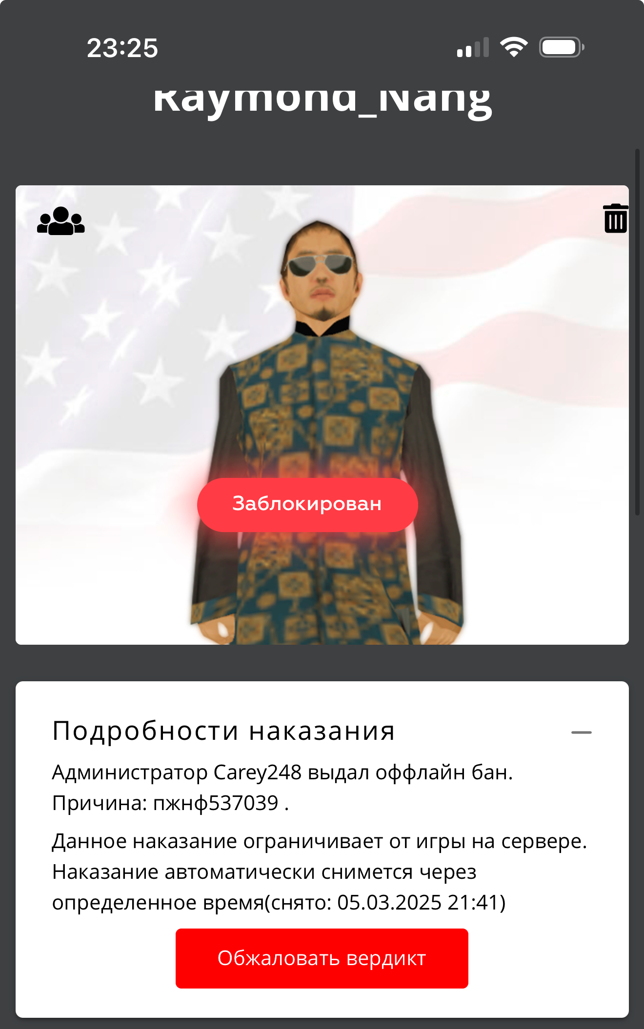Дата и время наказания/нарушения: 23 Фев 2025