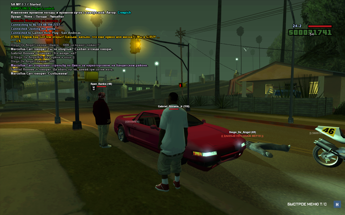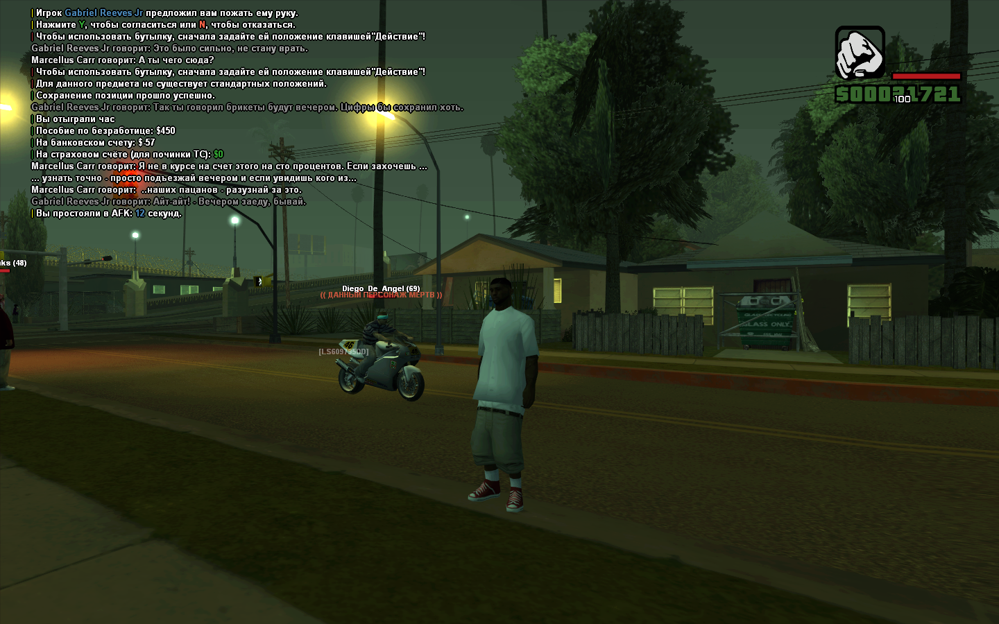 увы, первый скрин я потерял, где разговариваю с этим парнем и пытаюсь договориться о продаже наркотиков, а там уже ТС жалобы подъезжает. я ему кинул предупреждение - он проигнорировал. затем я свернул игру, мне пришлось релогаться и по своему возвращению я опять таки увидел диего, пытающегося продать наркотики габриелю. предупредил его второй раз - видно в чате. подождал полминуты. мне банально заеблось ждать чего-то от типа, который вот-вот уже деньги с моего клиента возьмет и как будто бы не слышит моих слов, думая, что я просто проигнорирую такие наглые действия.