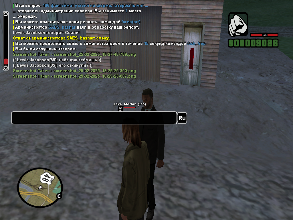 Суть жалобы: Приезжает человек с серым ником и начинает со мной взаимодействие у моего дома в захалустье. Спрашивает нет ли проблем, после чего у нас начинается как я думал вначале более менее адекватное взаимодействие. но потом он начинает творить хрень, писать в чат непонятно что, фангеймить, скролить тайзер, а после и огрел меня с него без отыгровки. я написал репорт на который ответил ассист са ес, дальше мне его судьба не известна, но меня дико возмущают такие игроки правительсва округа.