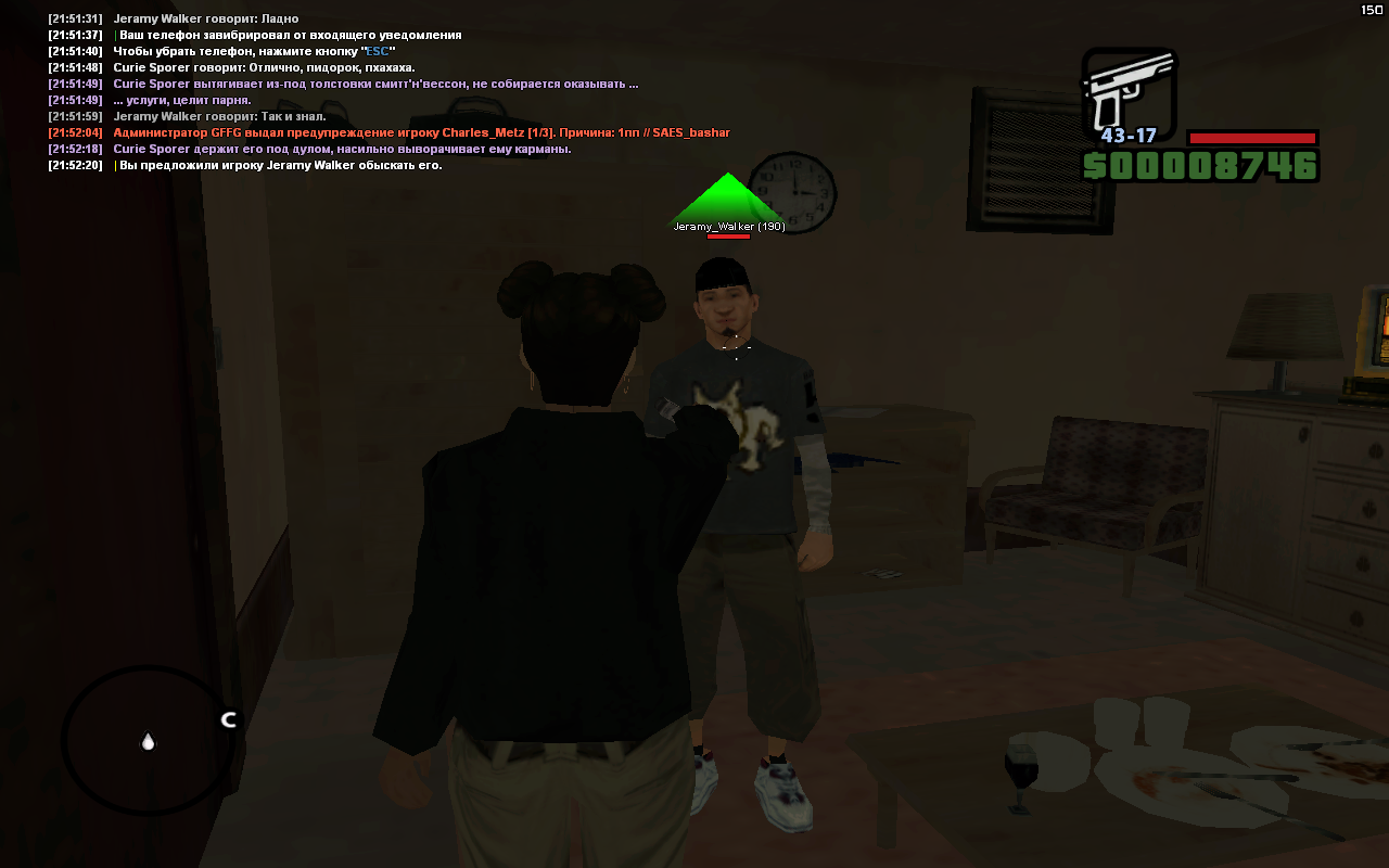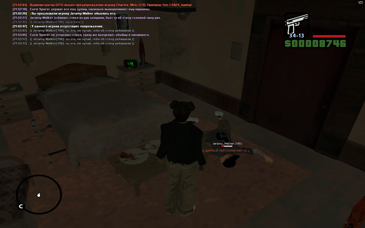 Суть жалобы: Играли ситу, девушка решила меня ограбить, направила ствол, сама же она хрупкая и маленькая. Мой же персонаж здоровый, накаченный амбал. Мой персонаж выбил ствол из её рук, именно выбил, а потом ещё и пару раз головой об стену девушку ударил. Ну согласитесь, что девушка не смогла бы удержать после такого пистолет, а тем более стрелять..