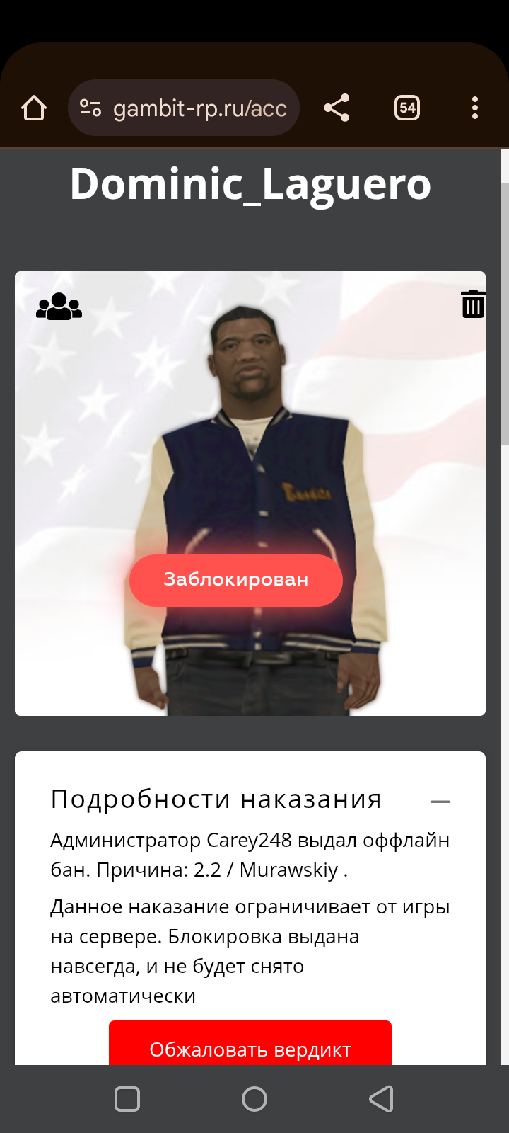 Ссылка на доказательства наказания/нарушения: https://forum.gambit-rp.ru/threads/537545/#post-6825309