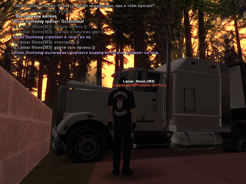отсюда и стрельба, дальше опять слезаю с байка пишу отыгру он уезжает епта, че делать я начал шмалять по нему, выследил и убил, открыть трак он не хотел я отыграл что уезжаю на его тягаче
