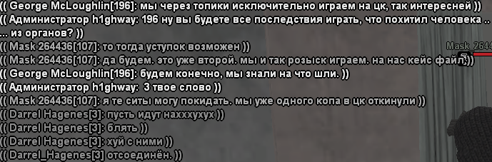 ну да, бан тебе снял, выдал цк. тебя похитила фракция маргиналов и вдобавок два нестандарта. мне пишут, что они готовы играть все последствия твоего похищения через топик, прикладывая все ссылки - при этом адекватно общаясь. на другой стороне ты, который в ООС чат оскорбляет все и вся, не говоря мне почти ничего по ситуации, хотя слово я тебе давал. кому мне верить, игрокам, которые приложили ссылки на все свои топики, объяснившим всю сиутацию или человеку, который банально не может объяснить суть своей претензии, кидаясь чисто недовольствами в ООС чате?