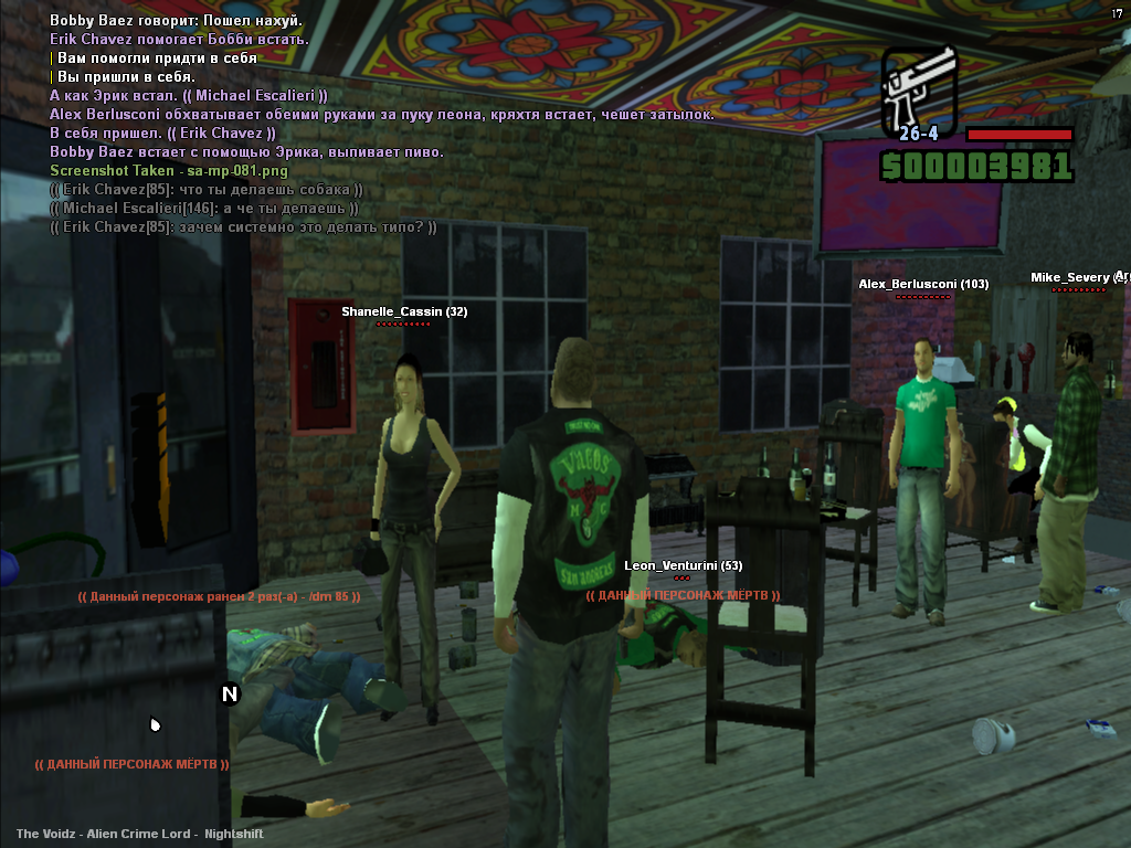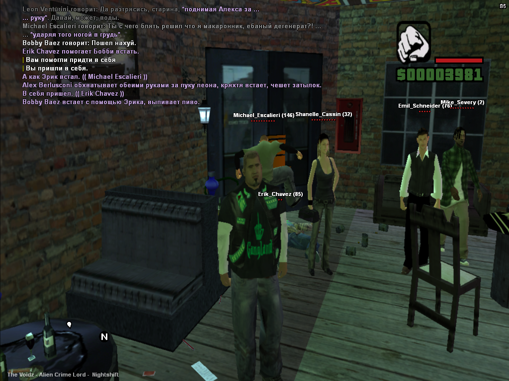 С чего же начинается ситуация? Мой соигрок Эрик Чавез инициирует взаимодействие с Алексом с просьбой отойти от стойки, действий не последовало. Словесный конфликт между персонажами перетекает в драку в ходе которой против нас участвовало сразу 3 человека.