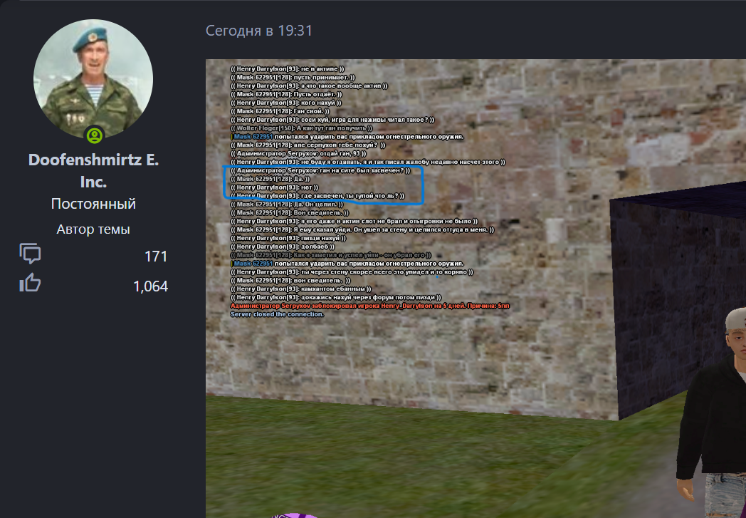 Что ты несешь, друг? Я говорю про то, что ты должен залить на мое нарушение свои доказательства и выдвинуть к СУЩЕСТВЕННЫМ ДОКАЗАТЕЛЬСТВАМ свою версию. Ты либо приколист, либо действительно того.по твоей позиции - я могу на пол сервака позаливать жалобу нагло обманывая администрацию и требовать док-ва и опровержение от игроков которые нихуя не скринили и не записывали