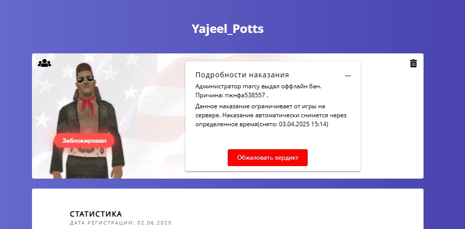Суть жалобы: Перевыдали бан за 40.1пп, на счет возраста и количества денег на балансе, моему аккаунту а именно персонажу Yajeel Potts 5 лет, дата регистрации 02.06.2020, мне что каждый год нужно покупать купон на смену возраста? Я так же могу не играть свое имущество если я его не использую, а его как раз таки не использую и не играю как будто это моя машина (приведу банальный пример когда ассисты играют фракции, имея бизнесы купленые ранее, ЗАЧЕМ же они тогда грабят кого то играя криминальную ячейку? Они же имею на балансе аккаунта несколько миллионов и бизнес приносящий пассивный доход), баланс на счету разве показать чего либо? У нас что нет причины для ограбления если у одного из грабителей 0 на счету а на втором держится вся экономика сервера? Да и в приципе пункт правил по которому меня забанили, это использование лицензионного оружия, я из этого лицензионного оружия стреляю? Убиваю кого то? Цель была - ограбление, оно удалось, никого не убили и никому это оружие не причино критического вреда. Если у меня на аккаунте есть лицензия, мне нельзя его использовать? То что я ее использую это только лишь вытекающие последствия для моего персонажа, на блокировку не тянет. Просто рыскали до чего докопаться, когда поняли что ваш ассист выдал баны за ерунду, и все его обвинения это пустышка, долго долго рыскали и нашли до чего докапаться. Такая же грубая душниловка как и ранее. Да и ваше обвинение что я каким то образом абужу систему лицензии, это вообще откуда взято? Каким образом абуз происходит?? И далее "И для этого совершает свою криминальную деятельность" Я вроде бы хорошо знаю русский язык, но все же не понимаю, правильно ли вы обладаете банальным строением предложений, это обвинение в пустую.