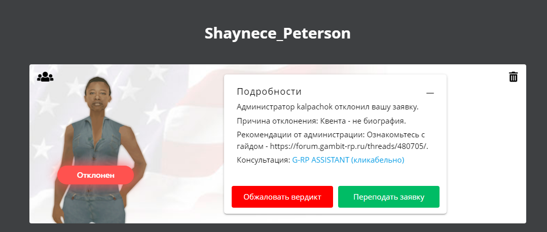 Тут есть упоминание, что связалась з бандой, пытается зарботать деньги и употребляет легкие наркотики, но это не даёт понимания чем персонаж собирается заниматься на сервере. Может ли она убить человека когда без этого можно обойтись один из главных вопросов который должен быть нам понятен на случай если надо будет разбирать какую-то такую весьма распространенную ситуацию. Тут непонятно. Потом страхи и слабые стороны, они нужны чтобы ограничивать свободу действий персонажа в определённых ситуациях, ведь у всех есть недостатки. В целом квента неплохая, осталось дописать конкретно то, что вас просят в рекомендациях при отклонении.
