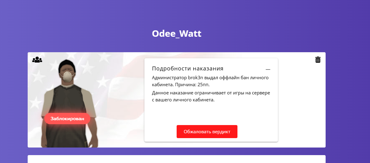 Суть жалобы: Добрый день, забанили снова за 25пп, но со мной проблема решилась в прошлой жалобе, мне не выдавали никаких наказаний с момента рега даже после жалобы.