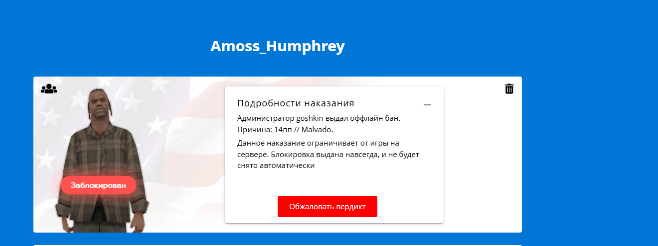 Лан, бессмыслено спорить с человеком который юзает СПИДХАК и вообще ничего не отыгрывает. Ты итак ниче не поймешь, похуй. Не хочу дальше оффтопить. Сделал я всё по рп, с отыгровками, откатами ситуаций и прочим.Что ты несёшь. Ты целенаправленно хотел нас двоих убить, непонятно за что, но предоставив мнимую отыгровку стрельбы. Как я понял ты только что из рехаба вышел, тобиш был в ЧС, так что ну твое наказание обоснованно полностью. Ты полную хероту сделал, согласись, и достойно прими блокировку. Мы с корешом уже свои наказания получили