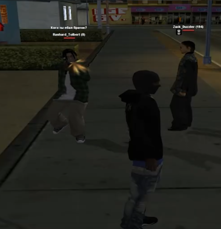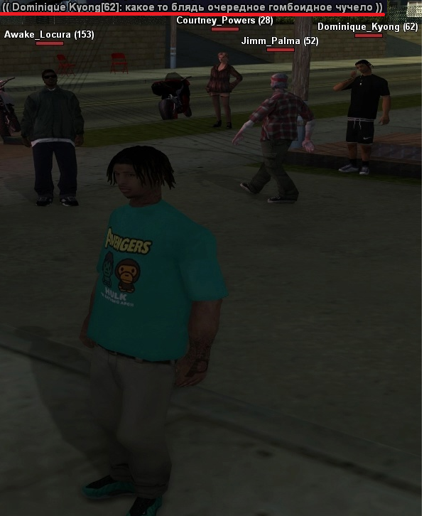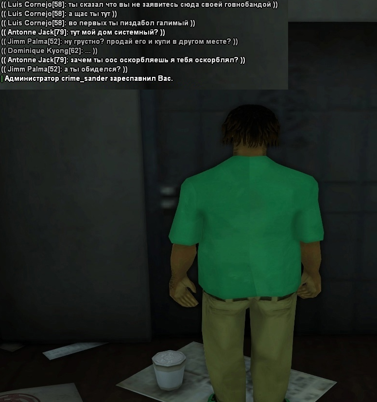 2) Поздно ночью после работы мой соигрок зашел в игру, чтобы забрать закуп, и увидел, как толпа "All Gas" толпится прямо у порога его системного дома, да еще и граффити на стене нарисовали. Раньше они держались у дома напротив и не лезли, потому что у нас была договоренность о нейтралитете, но тут вдруг решили внаглую занять территорию. Он задал им вопрос IC, почему они тусуются именно возле его дома, но вместо нормального ответа началась словесная перепалка, которая быстро переросла в OOC-срач. В итоге администратор Сандер просто берет и респавнит его.
