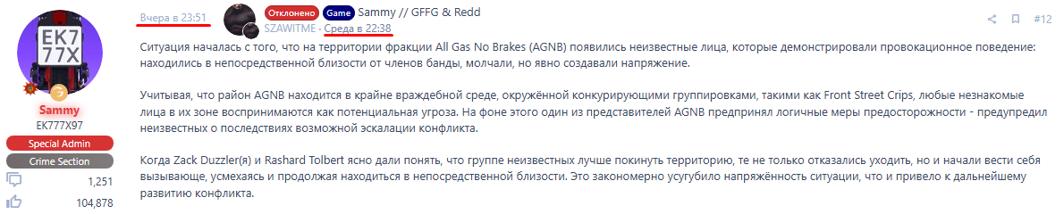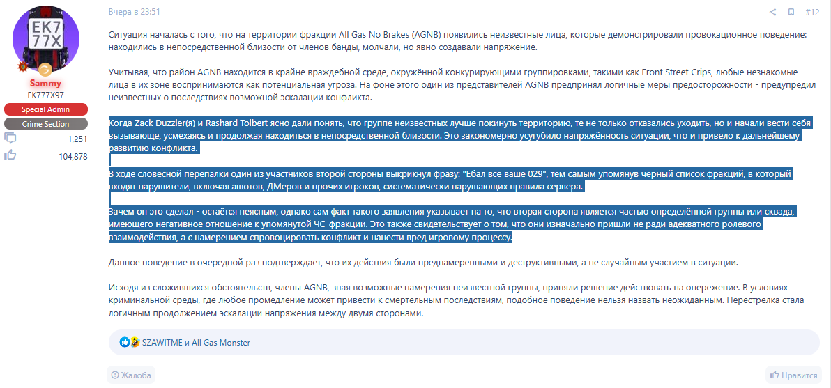 1) Всё началось с обычной игры 12 марта, когда один из игроков нашей фракции просто показал жест проезжающему игроку, который был из фракции «All Gas No Brakes», где играют эти админы. На это они решили отреагировать неадекватно - подъехали и без каких либо разбирательств и отыгровок открыли огонь по всей нашей банде. Естественно, в такой ситуации они погибли. Но вот что произошло дальше: админ с их фракции, чтобы скрыть ошибки своих игроков и поднять их, заблокировал одного из наших, который просто открыл ответный огонь по тем, кто первым начал стрелять.