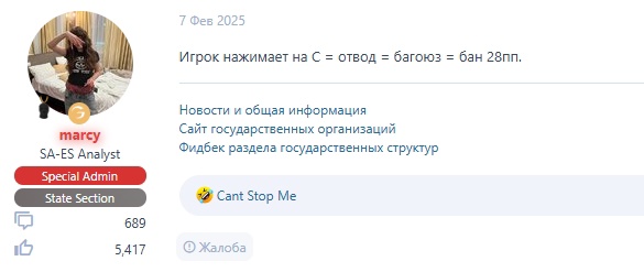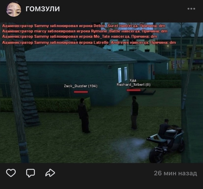 А самое интересное, что после того как мой игрок подал жалобу на форуме по поводу блокировки за ДМ, в ответ на это был опубликован пост в их паблике «Гомзули», где была прикреплена фотография форумного аккаунта человека, который написал жалобу на их фракцию.