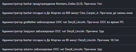Суть жалобы: Не согласен с наказанием, выдали варн за слово "дура" в оос чате, могли бы выдать Мут но за одно слово в оос чат варн выдали, оскорбил я девушку потому что она проигнорила мою отыгровку и побежала к копам