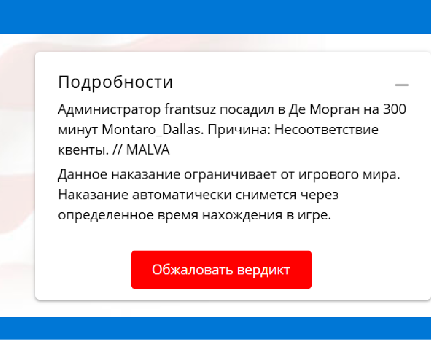 Суть жалобы: Выдали деморган за неправильную квенту, я забыл её изменить когда изменил ник, выпустите из деморгана