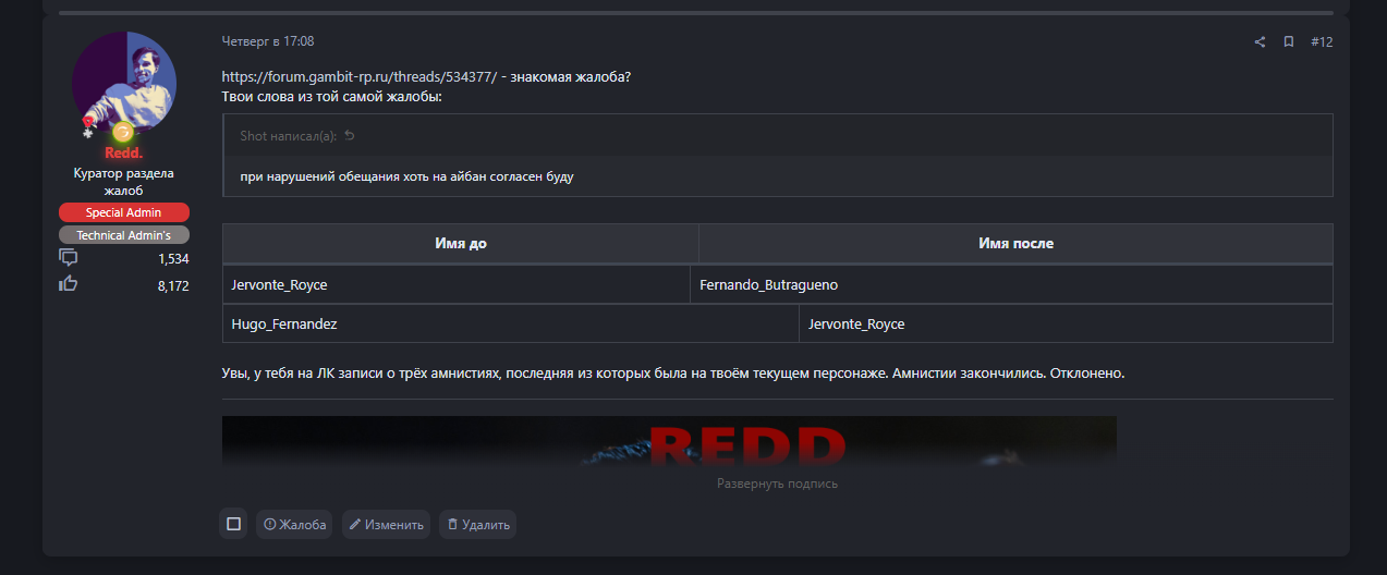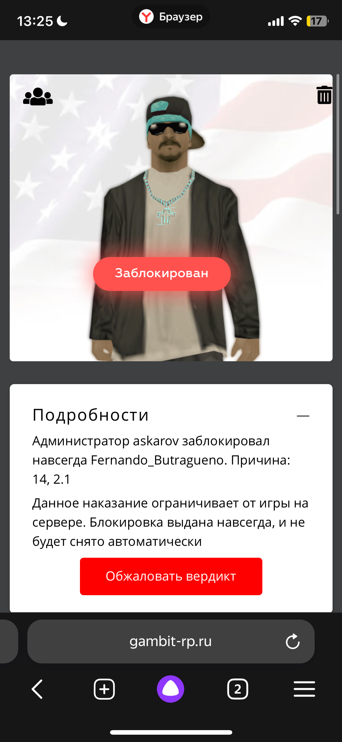 В это же время, незнакомый парень начал фгшить и нести бред, я не обратил на это внимание и мы поехали дальше не поиски. Найдя напавших ранее парней, я увидел что их всего 2 штуки и было бы логичнее так же отпинать их и все, но я заметил как мой друг идет обходить и вероятнее всего хочет начать стрельбу. Я спрятался за машиной, да-бы не попасть под обстрел и собственно мои парни и начали стрелять по ним, но не тут то было, они открыли ответный огонь. Решив поддержать своих я так же начинаю по ним стрельбу и убив всех мы начали уезжать. По итогу, все в блокировке за 14 ПП и 2.1 ПП. Признаюсь, виноват, ранее был амнистирован за схожие наказания, хоть это и было 3 месяца назад. Но за все это время я на протяжений 3 месяцев ни разу не нарушал, вступил в ЛССД, САДОК. Играю в крайм одобре, буквально большую часть работы по обучению новичков и набору состава и создания игры беру на себя. Все это делаю без фангейма, исключительно помогая новичкам. Множество раз занимал какие либо должности ранее, Хелпера дважды, Гейм мастера трижды и единожды администратора. Я лишь прошу в последний раз простить и амнистировать моего персонажа. Играю за него с 2022 года и в целом он для меня важен не только имуществом, но и в целом воспоминаниями во время игры на нем. Как по мне все же это слишком, выдавать айбан за ДМ, учитывая что стрельбу я открыл ответную. Я ведь не виноват в том что мой соигрок открыл стрельбу, при ненадобности.