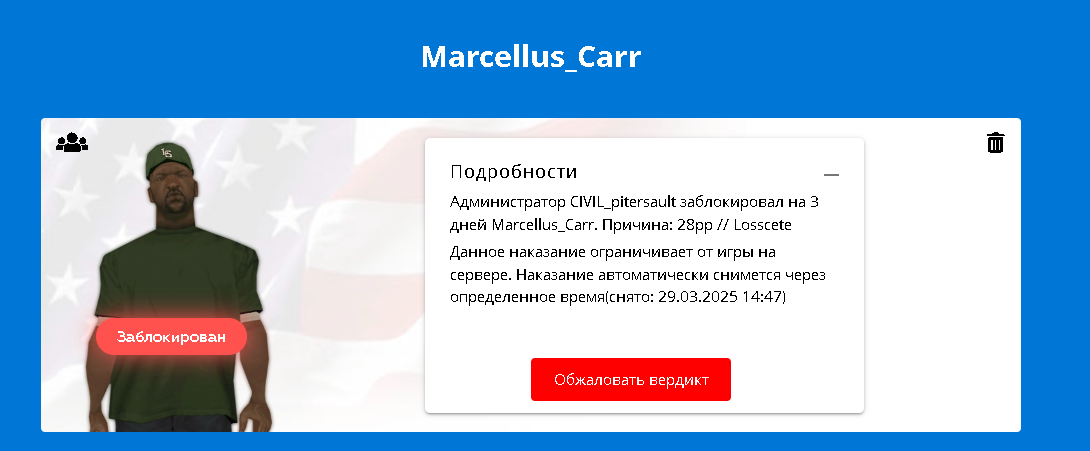 я НЕ ВИНЮ ни Losscete, ни marcy. просто я считаю, что сама по себе ситуация вышла некрасивой. и да, с моей стороны есть небольшой проступок - не надо было заводить разговор с другими игроками. но мое мнение таково, что за такой маленький проступок вообще не стоило меня блокировать на 3 дня. я активный игрок одобренной криминальной фракции, я никогда и ни с одного персонажа не был забанен по 28ПП. но конкретно сейчас меня банят просто за то, что я... случайно сбил анимацию?