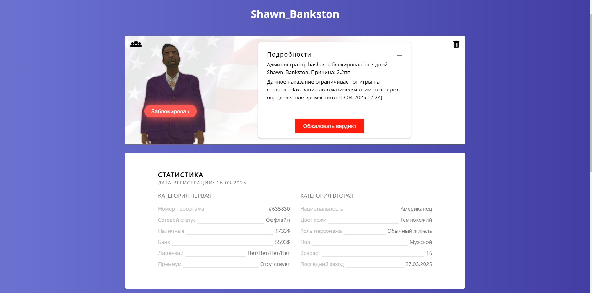Суть жалобы: Не понимаю за что дали данное наказание, как обратился к правилам сервера, увидел что это за несоответствие роли, какое не соответствие роли может быть в данной ситуацие? Человек взял, со стволом начал бегать за мной без оттыгровок, с якобы целью ограбления, а когда я достал обрез, и убил игрока, мне дали блокировку, хотя я оттыграл.