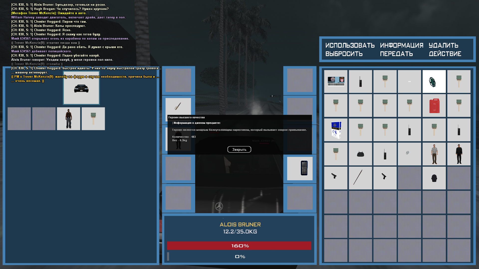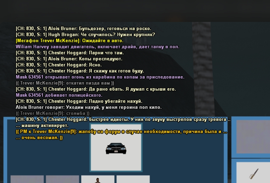 Суть жалобы: Началось все с неадекватного вождения с их стороны, виляния по дороге, дрифт, развороты, остановил напротив качалки Гентона, запросил юнит для проведения трафик-стопа, чисто чтобы если начнут уезжать помог, не дождавшись юнита от наших патрулей они тронулись, я собрал тактический, далее по видео видно что ребята заезжают в переулок между лос флоресом и чуть выше карвоша, парень надевает маску достает карабин, вылезает и дает мне в голову с отыгровкой "открывает огонь по копам за ПРИСЛЕДОВАНИЕ", а после и "добивает полицейского", что к сожалению не попало в откат. Уведомил ребят что откатил убийство мое, что вот за преследование не убивают, на что они мне ответили у нас машина полная героина и оружия, но впринципе их никто не собирался задерживать если бы они просто встали на месте и получили штраф. Они сами же спровоцировали погоню за собой, мои намерения лишь были провести трафик-стоп простой и отпустить.